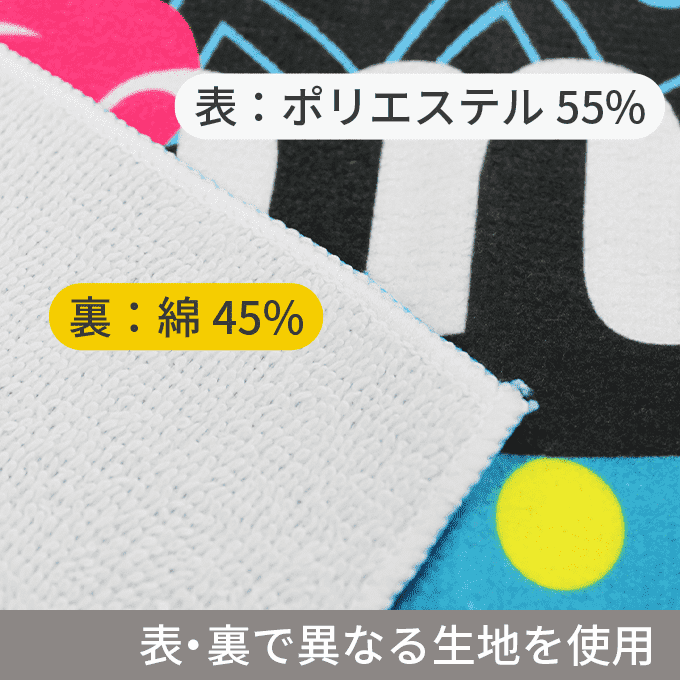 | 素材 | 表 ポリエステル 55% 裏 綿 45% ※全体を100%とした場合の比率。 組成は表がポリエステル100%、裏が綿100%です。 |