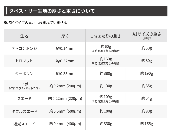 ・テトロンポンジ ・トロマット ・ターポリン ・ユポ ・ユポ+グロスラミ ・ユポ+マットラミ ・スエード ・ダブルスエード ・遮光スエード |